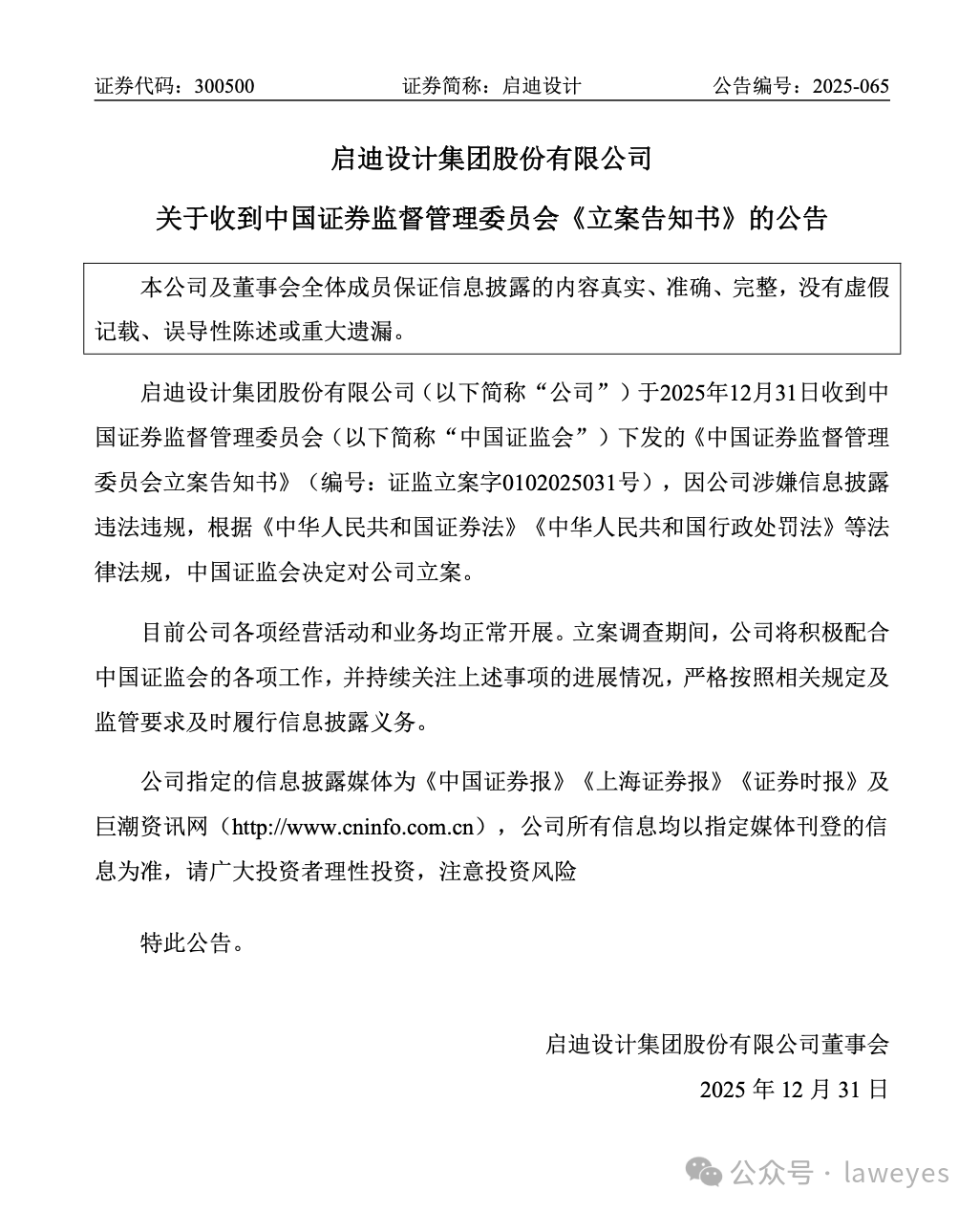 2025年12月31日晚间,启迪设计集团股份有限公司(股票简称:启迪设计,证券代码:300500)发布公告称,公司收到中国证监会《立案告知书》(编号:证监立案字0102025031号),因公司涉嫌信息披露违法违规,根据相关法律法规,中国证监会决定对公司立案。