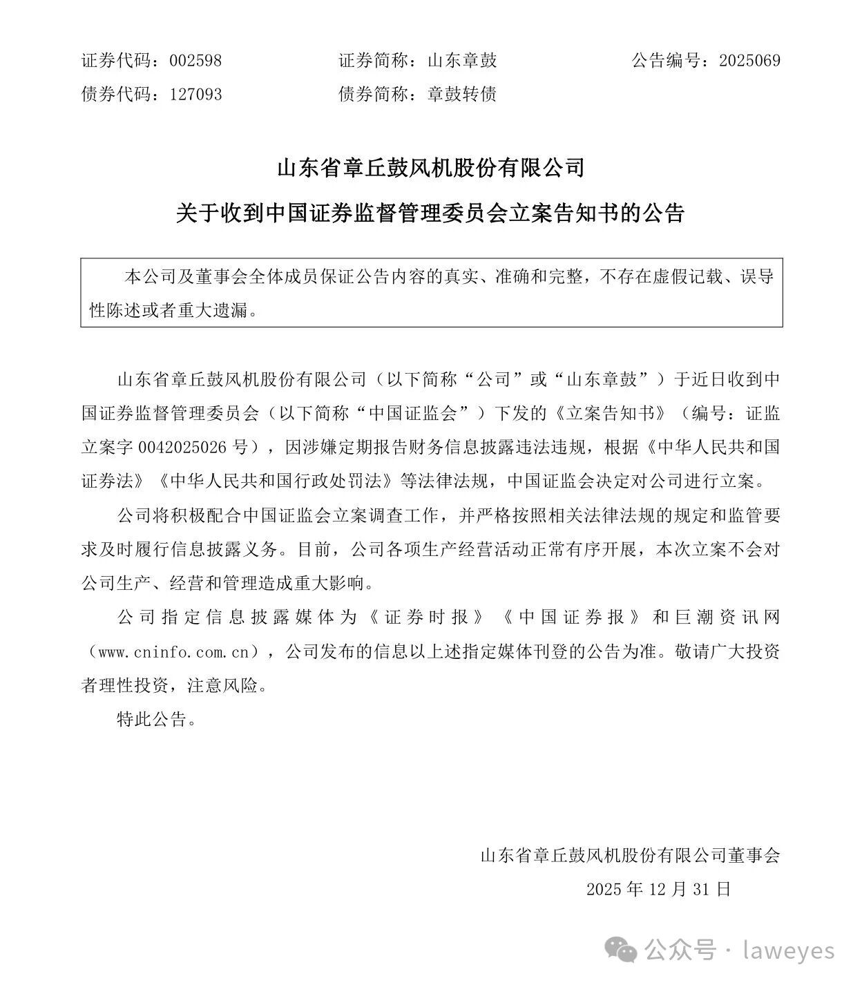 2025年12月31日,山东省章丘鼓风机股份有限公司(股票简称:山东章鼓,证券代码:002598)发布公告称,收到了中国证监会下发的《立案告知书》(编号:证监立案字 0042025026 号),因涉嫌定期报告财务信息披露违法违规,中国证监会决定对公司进行立案。