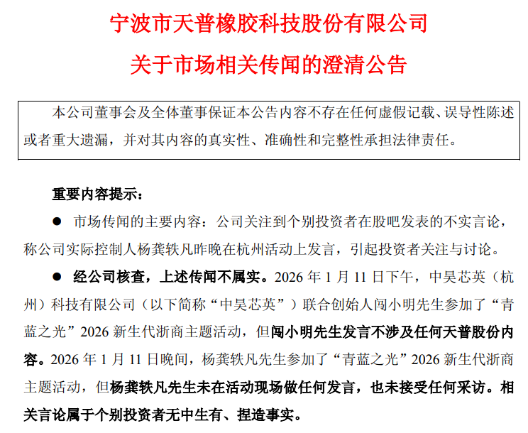 天普股份表示,1月11日下午,中昊芯英(杭州)科技有限公司联合创始人闯小明参加了“青蓝之光”2026新生代浙商主题活动,但闯小明发言不涉及任何天普股份内容。1月11日晚间,杨龚轶凡参加了“青蓝之光”2026新生代浙商主题活动,但杨龚轶凡未在活动现场做任何发言,也未接受任何采访。相关言论属于个别投资者无中生有、捏造事实。